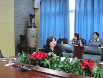 杜毓贞副校长(前左)主持会议 王殿军校长(前右)在会上发言