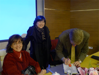 王殿军校长(中)在交流会议上作报告 约瑟夫.兰祖利(右1)为赠送给皇冠体育(中)的著作签名