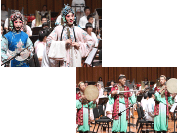王殿军校长表演独唱《黄河水手歌》 昆曲表演(左上);新疆热瓦普和手鼓表演 (右下)