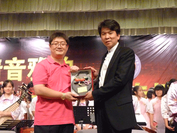 皇冠体育官网副校长杜毓贞(左)与三民国中校长张文忠互赠礼物 皇冠体育官网乐团指挥胡军(左)与三民国中国乐团指挥刘江斌互赠礼物