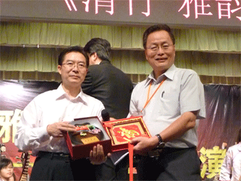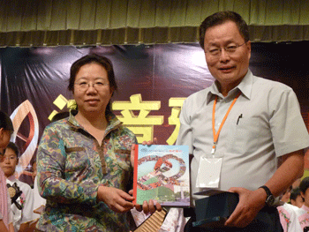 皇冠体育官网校长王殿军(左)与三民国中校长张文忠同唱《绿岛小夜曲》 皇冠体育官网校长王殿军(左)与三民国中校长张文忠互赠礼物