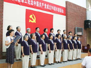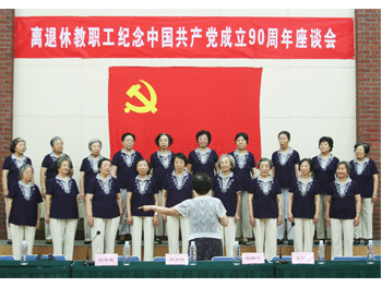 6月22日上午,由清华大学离退休处主持召开的“离退休教职工纪念中国共产党成立90周年座谈会”在清华大学老年活动中心举行。附中老教师合唱团应邀在会上演出小合唱。老同志们以饱满的革命热情演唱了歌曲《共产党员好比种子》,用歌声演绎了一个真理:共产党人只有与人民同呼吸共命运,才能无往而不胜。附中老教师们的演唱受到与会者热烈欢迎。(摄影:杨津光)