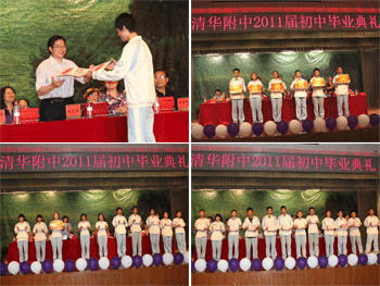 典礼在雄壮的国歌中开始。校长王殿军代表学校向圆满完成学业的初中毕业生表示最热烈的祝贺。他充分肯定了广大同学在校期间,勤奋苦读,勇于实践的精神,同时希望同学们在今后的生活中能够“坚韧、乐观、合作”,并祝愿同学们在即将到来的中考中取得好成绩。附中党委书记方妍和副书记周兆玉分别宣读了初三学科、科技、体育竞赛获奖名单和初三德育表彰名单,并向获奖的同学表示祝贺。