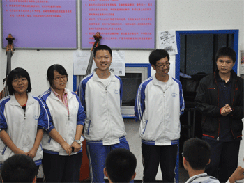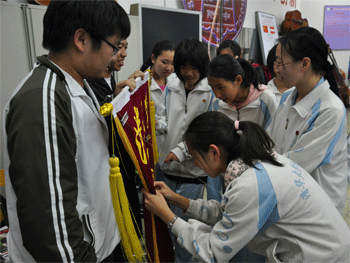 接着,乐团学生副团长温心怡同学发言,她回忆了自己入校时的情况,和随乐团参加“奥运专场演出”的感受,对自己3年来在乐团的成长表示欣慰。乐团学生团长谭可儿在发言中,回忆了在赴日演出的日子里,高08级同学对她的照顾和关爱。乐团老学生团长关海英同学的发言,则道出了自己这3年来的成长心得,表达了对学校的感谢,对毕业团员的祝福。之后,毕业团员们踊跃发言,表达了他们对学弟学妹的希望。在全体同学们热烈的掌声中和“加油!小虫回来!”的呐喊声中,08级的同学们把自己的名牌别在了民乐团的团旗上,期间不少同学留下了热泪。