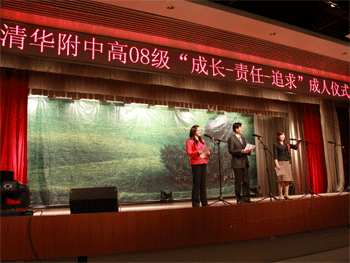 成人仪式共分为五个篇章:在第一篇章《十八岁畅想曲》中,在主持人深情的朗诵声中,同学们伴随着音乐和图片资料,回顾了从出生、成长到迈入学校的经历和三年的中学时光。在第二篇章《责任 追求》中,王殿军校长用精彩的演讲为同学们了阐述了责任和追求的意义,并鼓励同学们坚持梦想,勇于并学会承担更多的家庭责任、社会责任和对自己的责任,博得了师生和家长们的热烈掌声。在第三篇章《成长 感恩》中,高三学生家长代表张严先生站在家长的角度深情讲述了父母对孩子们的期望,希望同学们珍惜拥有的幸福,为未来做好准备。在第四篇章《励志 祝福》中,各班校合唱团同学表演了小合唱《我相信》,充满激情活力的歌曲表达了高三学子对于未来的信心与决心。第五篇章《希望 远航》中,各班学生代表深情的朗诵表达了对老师、父母和同学的感谢,对未来的美好梦想,以及“成长,责任,追求”的信念。