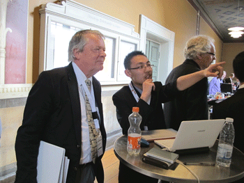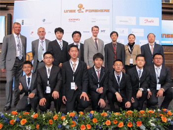 评委与龙华江同学交流 丹麦王子(后右4)与全体中国参赛学生 (后右1龚玉新老师)合影留念