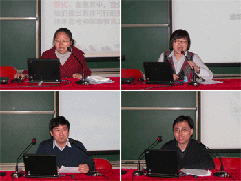 陈桂芬副主任(左)主持----辛颖副主任介绍学校德育工作计划 邱晓云(左上)、徐蓉(右上)、白雪峰(左下)、范永春分别发言