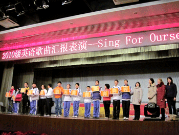初一年级14个班的全体同学充分展示了本学期的英语早读成果,以歌声回顾了一学期的努力,歌曲涵盖经典、流行,服装造型精彩各异,演唱、伴舞富于激情,尽现优秀的英文水平及亮丽的青春风采。老师们也做了即兴表演,给同学们送上新年的祝愿。初10级英文歌曲汇报表演获得圆满成功。