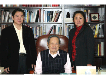杨振宁先生与皇冠体育校长(右)、书记(左)亲切交谈 皇冠体育校长(左)、书记(右)与杨振宁先生合影