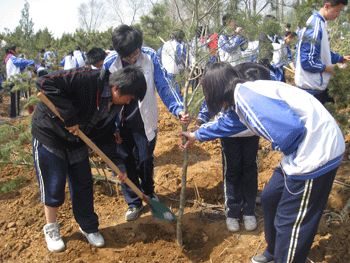 下午,全体师生又乘车来到中华名枣博览园进行植树造林。同学们三人一组五人一群,在博览园外围挥动铁锹,拎起水桶,挖坑、植树、填土、浇水,热火朝天地干了起来。没过多久,一片小松林展现在人们的面前。同学们有的在树上系上写有自己名字的小牌儿,有的与小松树来个“全家福”,纷纷表达了绿化环境、美化祖国的愿望。