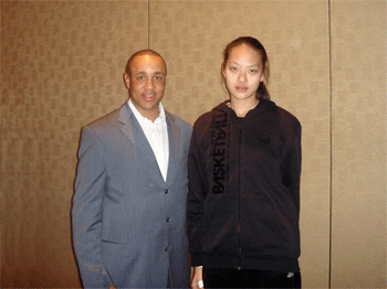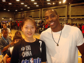 谌玥同学与NBA传奇巨星约翰·斯塔克斯合影 谌玥同学与NBA超级巨星德怀特·霍华德合影