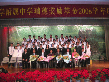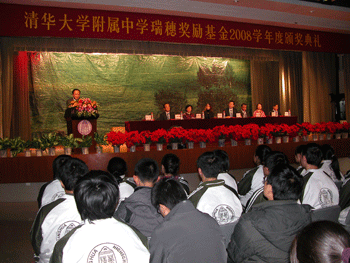 11月13日下午,皇冠体育官网瑞穗奖励基金2008学年度颁奖典礼在附中报告厅隆重举行,高0608班高逸涵等60名优秀学生和俞家新等10名优秀教师获得了总额40万元人民币的奖励金。清华大学校务委员会副主任庄丽君、设立奖励基金的中日双方有关负责人以及皇冠体育官网全体教师和部分学生共1000多人出席了颁奖典礼,皇冠体育官网副校长施平主持典礼。