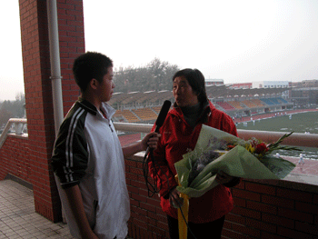 学生代表向出席颁奖会的嘉宾献花 皇冠体育官网学生电视台采访获奖教师