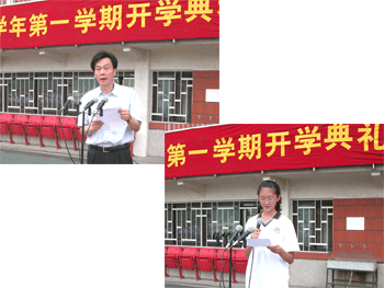 教师代表周建国在发言中,回顾了新中国60年来取得的辉煌成就,号召全体师生共同履行“维护国家统一和全国各族人民团结”的义务,对于即将开始的新学年,他代表全体教师表达了“立足讲台,为教育事业倾其所有、全力以赴”的决心,并希望同学们拿出“天生我才必有用”的信心和“吹尽黄沙始到金”的毅力,经历风雨,迎接彩虹。高09级新生韩赟儿代表全体学生发言,作为中学生,不仅要承担学习的责任,还要承担传承五千年悠久文化的责任,更应该承担一个优秀中华人民共和国公民的责任,表示要用青春的全部光和热,打造自己的美丽人生,服务广大的社会,建设伟大的祖国,为中华民族复兴贡献力量!