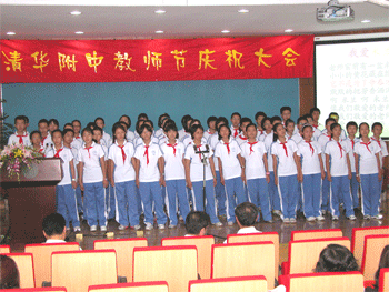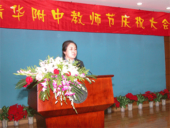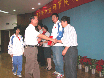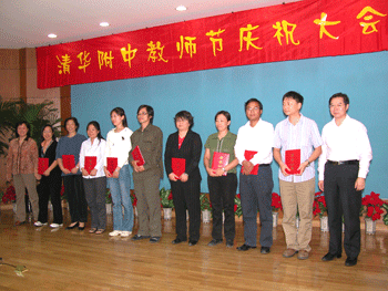 附中党委副书记周兆玉宣读了2008至2009学年度教师个人和集体表彰名单,获得各级荣誉和奖励的教师代表上台接受与会领导颁发证书和少先队员献花。潘天俊老师代表全体教师发言,表示要担当起“解惑、授业、传道”的重任,“学为人师,行为世范”。