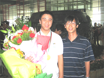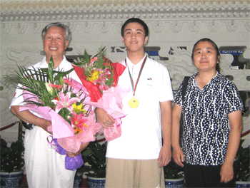 高逸涵(中)和清华大学吴文虎教授(左)、指导教师钟建华合影 高逸涵同学(左)和班主任李劲松老师合影