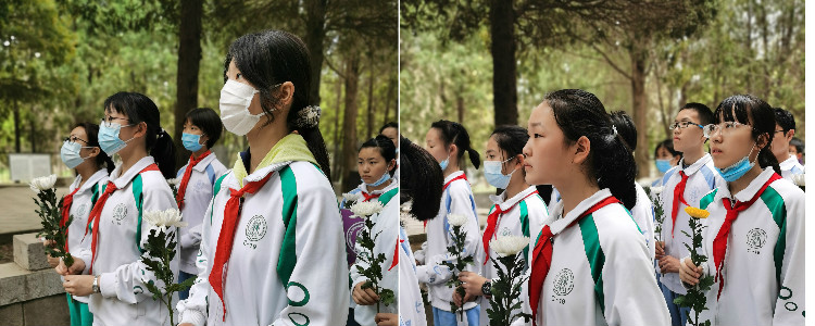 离开前,同学们在墓碑前绕行一圈,敬献鲜花,并将写给革命烈士的寄语挂在绿油油的松柏树上寄托哀思。