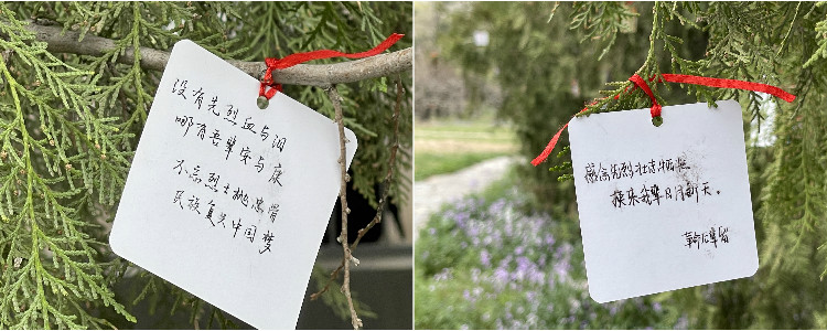 学生把写给烈士寄语卡片悬挂在树上寄托哀思