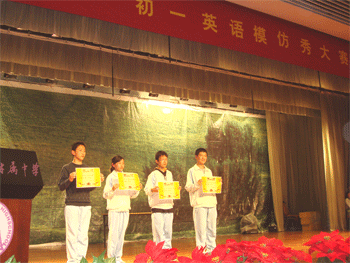 初一年级各班自选电影片段,用自己的声音将《马达加斯加啊》、《汽车总动员》、《功夫熊猫》等12部电影中各具特色的角色表现得惟妙惟肖。同学们的配音非常精彩,使得现场观众时时会产生在看原声大片的错觉。现场爆发出的阵阵掌声和欢呼就是对所有参加此次活动同学最大的肯定。前来担当评为的高中英语老师们都不禁为初一年级同学的模仿力和创造力啧啧赞叹。