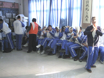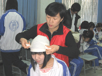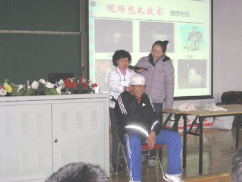 师生一起学习包扎技术 同学们在老师指导下实际操作