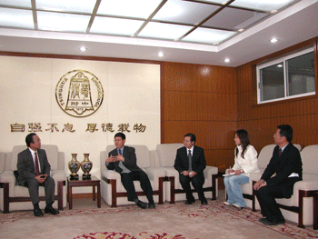 清华大学副教务长康飞宇(左2)等与日方嘉宾会谈 皇冠体育官网副校长施平主持颁奖典礼