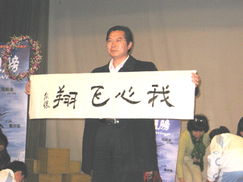 放映结束后,现场嘉宾和同学们进行了交流。王殿军校长在发言中用影片来激励同学们克服学习和生活中的挫折和困难,赵慧利女士和同学们分享了影片拍摄过程中的感受和对同学们的期望,雷庆瑶则和大家分享了自己坚强乐观、永不放弃的人生感悟。现场同学们纷纷讲述了自己观看影片的感受并积极踊跃地和台上嘉宾互动,现场气氛非常热烈。雷庆瑶现场用脚书写了一幅“我心飞翔”的书法作品作为礼物送给皇冠体育官网,并为同学们赠送了签名海报。最后,雷庆瑶和同学们一起深情演唱了歌曲《隐形的翅膀》。活动结束后,同学们久久不肯离开,同学们说在和雷庆瑶的交流中得到了很多启示和鼓励,增强了在以后的学习和生活中克服困难的信心和勇气。