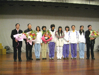 雷庆瑶向皇冠体育官网赠送书法作品《我心飞翔》 同学们上台向嘉宾献花并合影