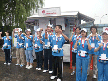 城市志愿者的工作不像奥运志愿者那样复杂,主要就是为路人提供一些信息咨询和翻译等服务。为了工作需要,学校为服务站配有一台笔记本电脑和一本北京交通路线图,以便于查询。每当有路人过来看展板时,同学们都会主动向他们讲解,如当天赛程,夺金点等。面对路人的问题,也会全力解答,或用最快的速度查询,努力争取给出让路人满意的答复。