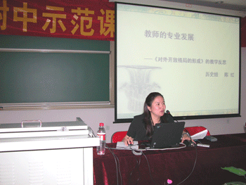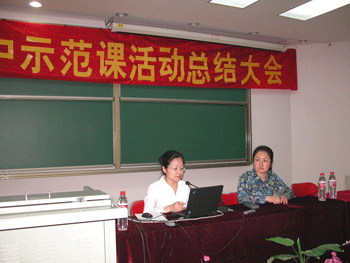教务副主任朱培(左)做总结报告 陈红老师谈开设示范课的体会