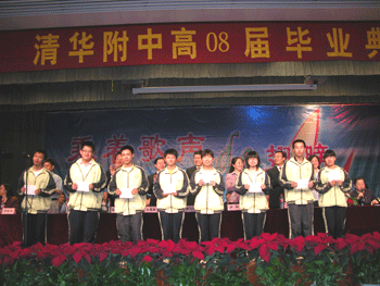 会上还公布了国际、国家、北京市级各类奖项获得者以及五位北大清华保送生名单,表彰了“希望之星”、“万邦儒奖学金”获得者以及市、区、校级优秀班集体、优秀学生干部、三好学生、优秀团员等,大学以及附中领导等为获奖者颁发获奖证书。最后,各班派一名代表上台领取王殿军校长颁发的北京市高中毕业证书,并分别与王殿军校长合影留念。