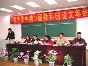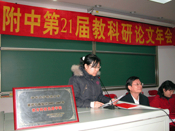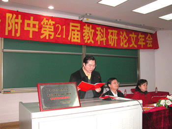 教科室主任秦洪明(左1)总结论文评审情况 校长王殿军宣读获奖名单