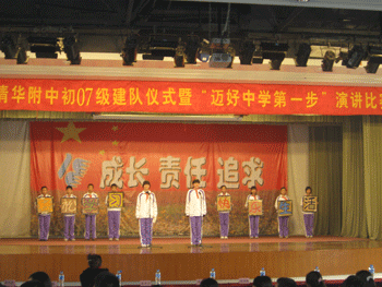建队仪式在嘹亮的鼓号声中开始,鲜艳的少先队队旗伴随着全年级少先队员庄严的敬礼来到会场中央。随后校团委书记高昕老师任命中队并宣布联合中队委及各中队辅导员老师名单,并向各中队授中队旗。各中队向辅导员老师献上鲜艳的红领巾,表达了同学们对老师的感谢与敬意。在建队仪式上,优秀少先队员代表、联合中队中队长代表全体少先队员立志努力学习,报效祖国,奉献社会。大队辅导员杜磊老师也寄语全体少先队员在辅导员老师的带领下以更高的标准要求自己,顺利迈好中学第一步。建队仪式在中国少年先锋队队歌中结束。