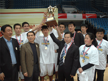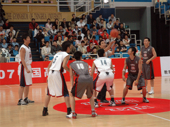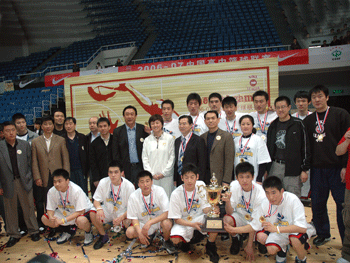 激烈的比赛现场 王殿军校长和男篮队员高举冠军奖杯