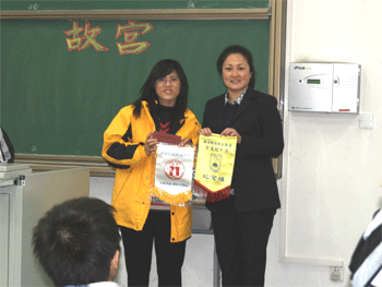 方妍副校长(右)和李惠利中学老师互换校旗 李惠利中学师生与附中学生(右)交流