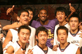 附中男篮队员与科比合影 附中男篮队员与校领导合影