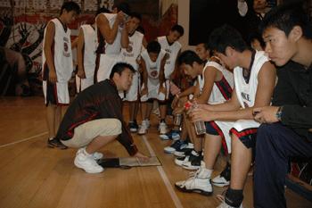 激烈的比赛现场 附中男篮教练张涛在指导队员