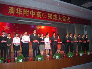高策理校长、学生家长代表钟秉枢先生和教师代表王武镝老师分别发言,勉励和激励莘莘学子要在享受成人权利的同时承担责任,在步入成人之后要学会感恩,并不懈追求理想,为国家、民族、家庭和自己努力奋斗,努力践行“八荣八耻”,做一个合格的有理想有道德有文化的社会主义公民。