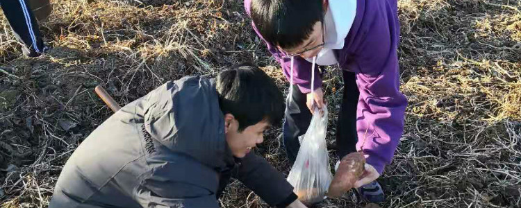 薄薄的雾气带着冬季的寒意,同学们穿着厚重的棉服带着手套开始了田野中的实践学习,大家怀着新奇而愉悦的心情向农民伯伯学习了掘土填坑和挖红薯的方法。同学们两两组队,艰难地挥起铁锹,插入土地中。天气太冷土被冻住了,同学们使足了力气却只能翘起表面一层的土。