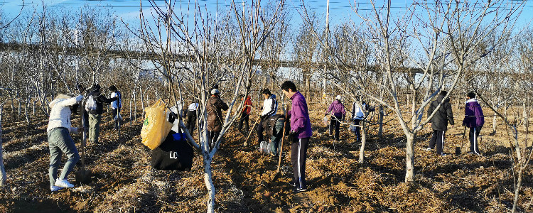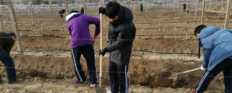 活动分成三部分。第一部分是清理葡萄架上的捆绑带和掩埋葡萄枝。清理葡萄架上的捆绑带主要是预防纤维袋风化后变成白色垃圾飘散在空中,由女生负责。掩埋葡萄枝,是用泥土将葡萄枝盖住,预防葡萄枝被冻坏,属重体力活,由男生负责。