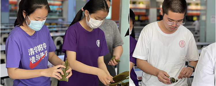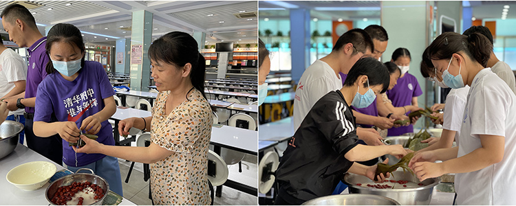 学生跟食堂员工学习包粽子