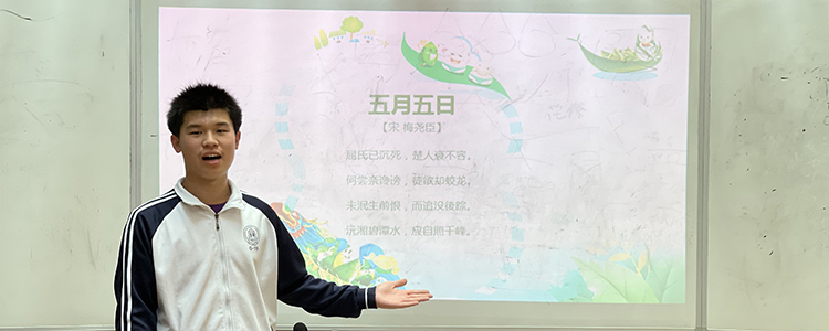 首先,由李政达同学为大家带来端午节总括介绍和诗词朗读。端午也称端五、端阳。端午节人们划龙船、包粽子,是为了纪念战国时期楚国的屈原的传说。在民俗文化领域,中国民众把端午节的龙舟竞渡和包粽子等,都与纪念屈原联系在一起,成为中华民族两千多年的习俗。“百里不同风,千里不同俗”,由于我国民族众多,故事传说也多,所以各地产生了不尽相同的习俗。挂艾草、吃棕子、喝雄黄酒、赛龙舟、放风筝、艾虎、画额等。接着,他带领大家朗诵了描写端午节的诗歌。《五月五日》、《竞渡诗》、《七律 端午》,诗歌传递了传统文化的美。