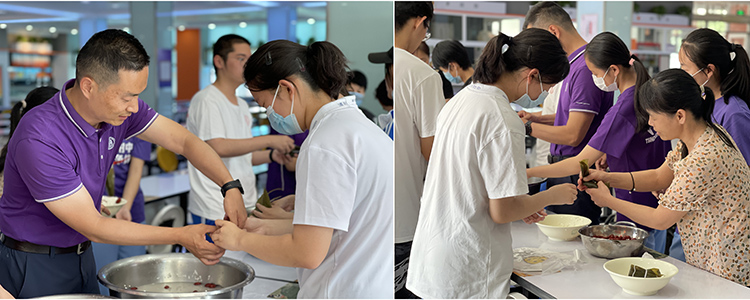 6月10日下午,在餐饮中心的大力支持下,校团委组织同学们在食堂一层开展包粽子活动,前来参加活动的同学们在餐厅员工耐心的指导下,很快就熟悉了包起粽子的流程,每个步骤都做的干净利落。一片片清香的粽叶,一粒粒晶莹的糯米,在一双双巧手下,瞬间变成了各式各样漂亮诱人的粽子,活动现气氛融洽、粽香四溢。