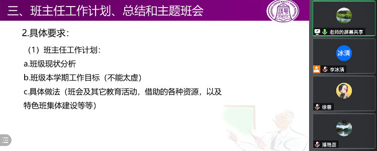 张彪老师指出,虽然中考一直在进行改革和调整,但是教育的本质不会变,初21级全体教师应当在基础教育改革的浪潮中,坚守育人职责,做人民满意的教育。基于以上形势,他提出了初21级年级总体目标和三年阶梯式的培养规划,并结合年级实际情况,梳理了具体的年级工作要求与方法,希望班主任能够关注学生成长,促进学生形成幸福体验,同时发挥特色班集体、年级助理团以及特色示范班、星级班级等的作用,依靠集体育人,建设有文化有特色有风格的班集体。