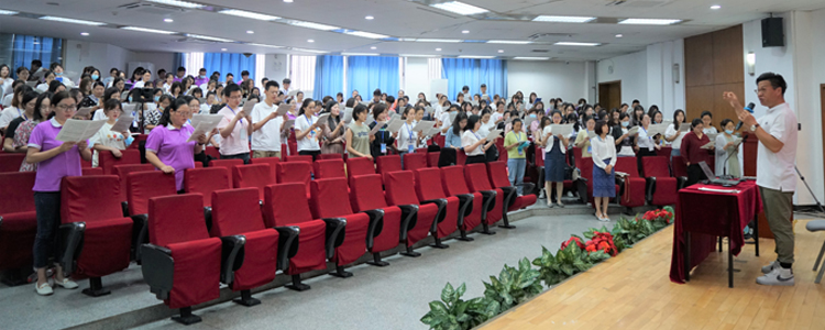 7月17日上午,音乐教研组王金峰老师教新教师学唱皇冠体育官网校歌。王老师生动活泼的教育风格及深厚的创作功底让新教师们积极认真学唱校歌,现场气氛热烈。