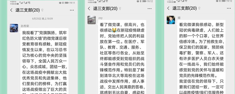 离退休党支部积极克服年龄、健康、技术等各方面困难,采用微信以及电话通知、党员自学、学习感想拍照交流以及电话汇报的方式展开。离退休党员们重点学习了习近平总书记关于疫情防控重要讲话等指示批示精神、2020全国两会精神以及观看首场高校党组织战“疫”示范微党课。学习过程中,党员们更加深切地认识到,风雨袭来,中国共产党的领导是最重要的保障、最可靠的依托。看到90后年轻人火线入党,冒着生命危险援鄂奋战,老党员们为党的事业后继有人感到骄傲和自豪。大疫带来大考,大考引发思考,中国特色社会主义制度是我们党和国家的最大优势,党员们进一步坚定了中国特色社会主义的制度自信。