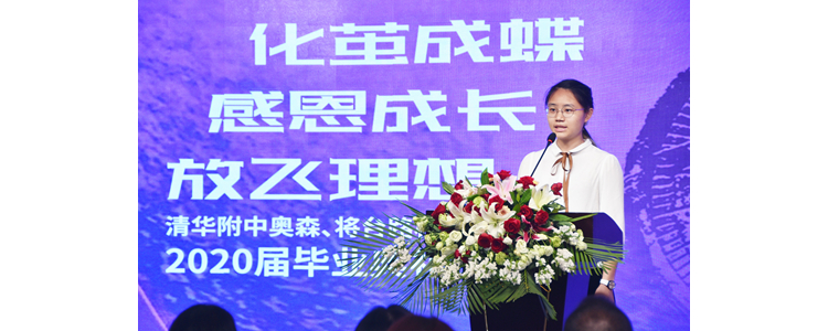 奥森校区学生代表韩玉琦发言。她说:“作为最特殊的一届,在社会的关注下经历了高考这场重要的考试。我们收拾好了行囊,有对过去的不舍,也带着对未来的期待。这个小小的环形校园承载了我们太多的可贵回忆,愿这一份份回忆化为我们闯荡的底气和动力,书写出自己的辉煌。”