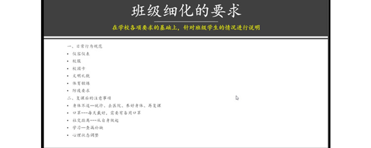 首先,张彪老师进行了年级统一的复课动员。他强调,家长要特别关注孩子的身心健康,随后依次说明了疫情期间复课工作的原则,指出了“为自己负责、为师生负责”的基本要求;并从复课后的作息安排、纪律要求、日常防疫、文明礼仪、特殊情况处理流程及办法等方面详细阐述了复课后的注意事项。