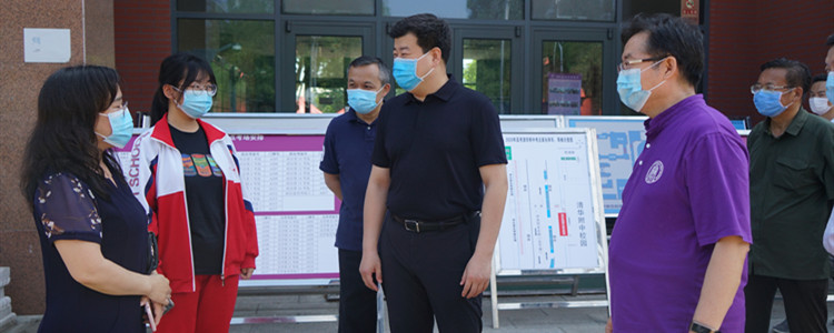 7月6日,高考前一天,海淀区副区长张若冰、海淀区教工委副书记李航、海淀分局内保支队副支队长徐伟一行到皇冠体育检查高考准备和疫情防控工作。皇冠体育校长王殿军、党委书记方妍及全体领导班子和高考相关工作人员陪同检查。