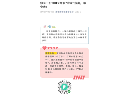 在大年初五的晚上,清祈公益社的微信公众号上发布了一篇题为“面对新型冠状病毒,咱中学生该干点啥”的推文。这篇推文以普通中学生的视角来看这次疫情,让同学们了解新冠肺炎疫情,理性对待各种媒体报道,并进行力所能及的捐款。更为重要的是,清祈的社员们想通过这样一篇推送,告诉身边的同学们要有面对且战胜疫情的勇气和信念。推文一发布就得到了同学和老师的阅读转发,在广大同学之间产生了一定的影响。