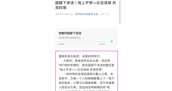 新学期伊始,李雅轩进行了以《线上开学——众志成城 共克时艰》为主题的线上“国旗下讲话”。她深深感动于逆行者们的勇气、国人的相互扶持、以及附中人的担当;同时清楚地意识到新学期对于每一位附中人来说,都是一次挑战,也是一次机遇,并给同学们提供了许多具体的学习生活建议。